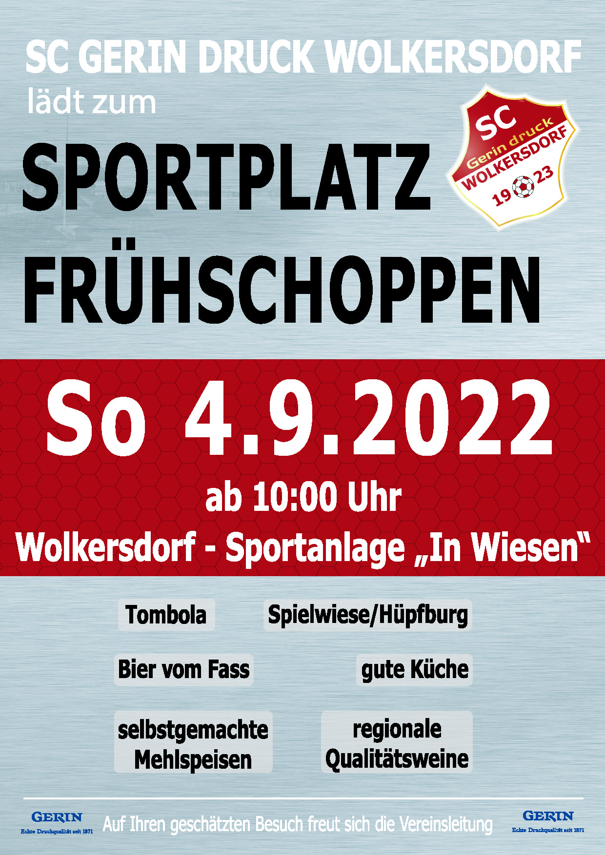 Aug.192022Am 4.9. findet unser traditioneller Frühschoppen statt, es geht ab 10:00 Uhr los. Der SCW freut sich über zahlreiche Besucher. FacebookPinterestTwitterLinkedinKommentarnavigationZurückVorheriger Beitrag:AUSWÄRTSSIEG IN KATZELSDORFNächstesNächster Beitrag:Klarer Derbysieg und Tabellenführung